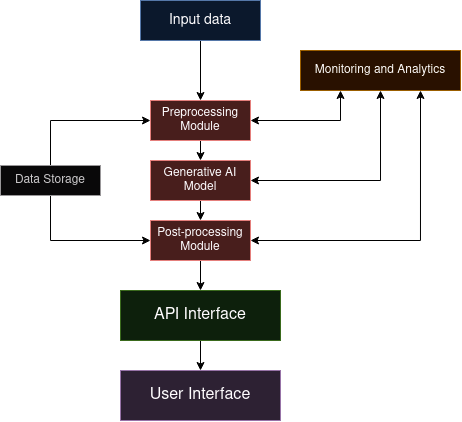 This diagram illustrates the flow of data and processes in a typical generative AI architecture. The input data is first preprocessed and then fed into the generative AI model. The model’s output undergoes post-processing before being served through an API interface to the user interface. Throughout this process, monitoring and analytics systems oversee key components, while data storage supports both preprocessing and post-processing stages.